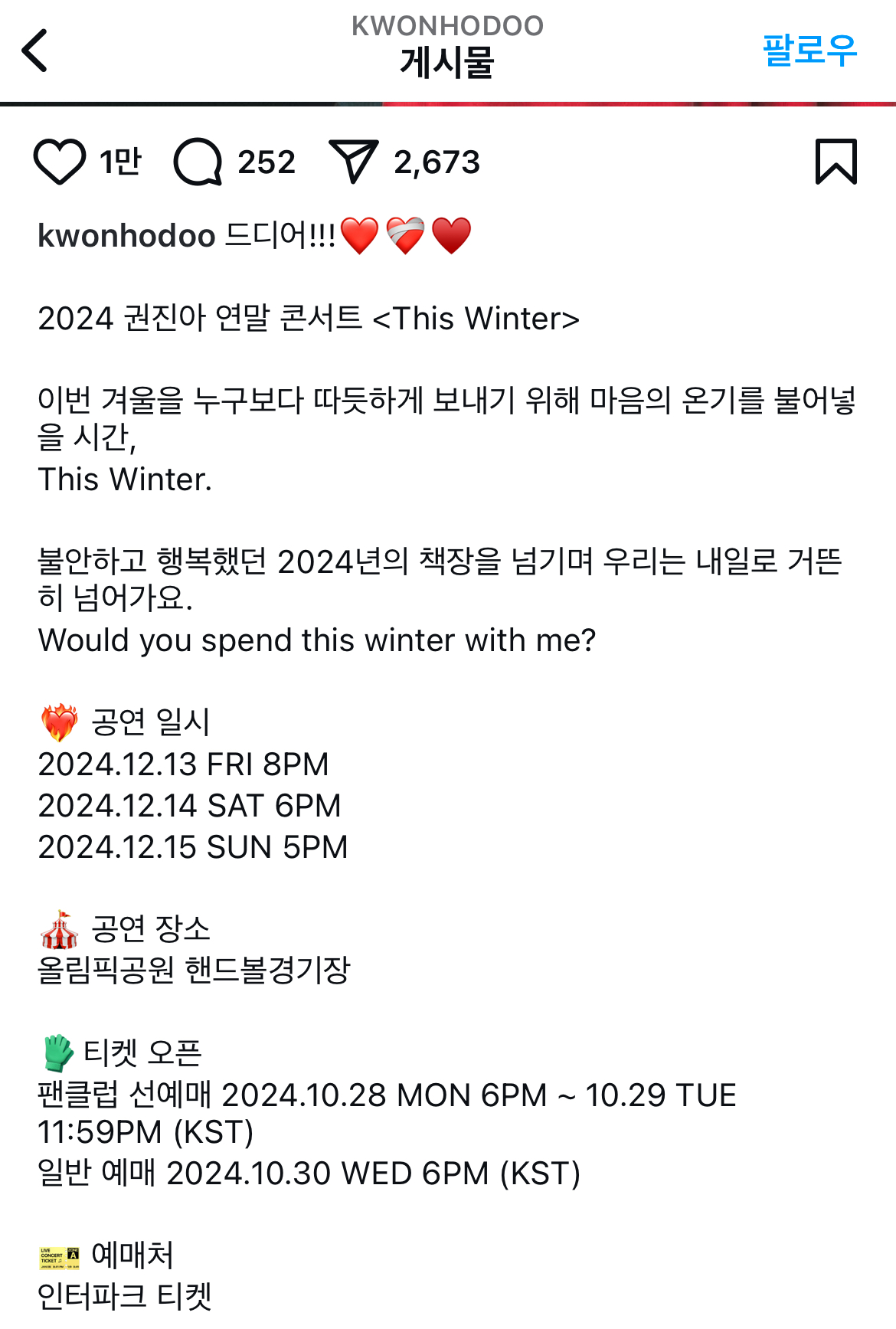 팬클럽 선예매는 10월 28일 오후 6시부터, 일반 예매는 10월 30일 오후 8시부터 인터파크 티켓에서 시작됩니다. 올해의 마지막을 권진아와 함께 따뜻하게 보내고 싶다면, 예매 날짜 꼭 기억해 두세요!
