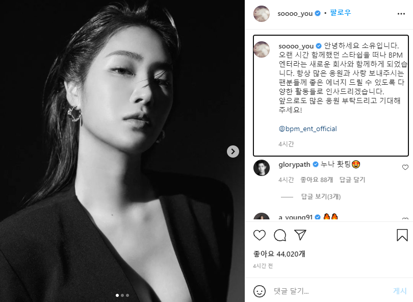 2010년 씨스타로 데뷔하면서 처음부터 약 11년간 함께했던 스타쉽을 떠나 새로운 전속계약을 통해 앞으로 나아가는 소유!! BPM과 함께 앞으로도 좋은 노래 많이 부탁드립니다.^^