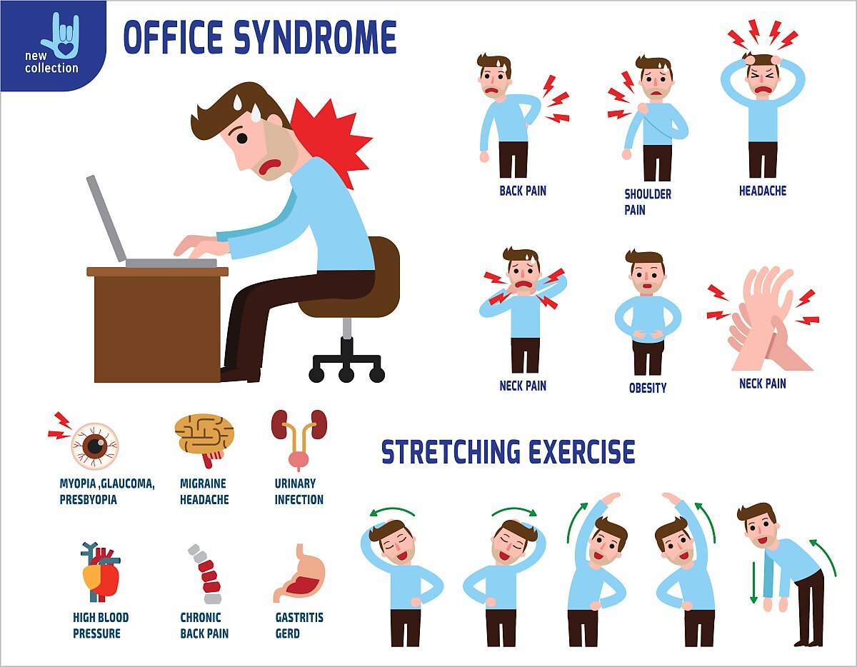 의자병을 예로들자면 허리디스크, 요통, 거북목 증후군, 혈액순환 장애, 손목터널 증후군 등을 말한다고 합니다.