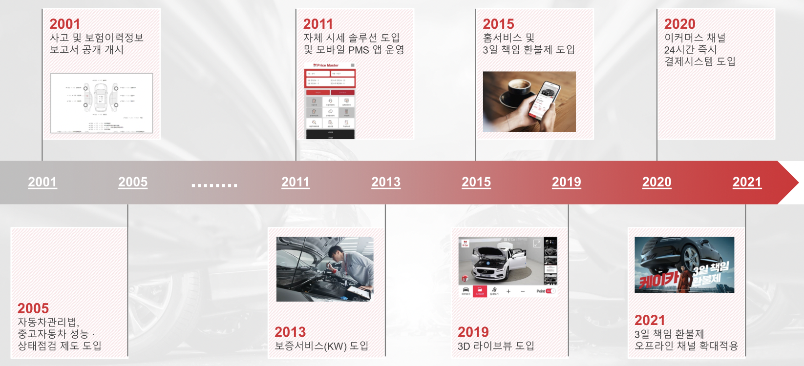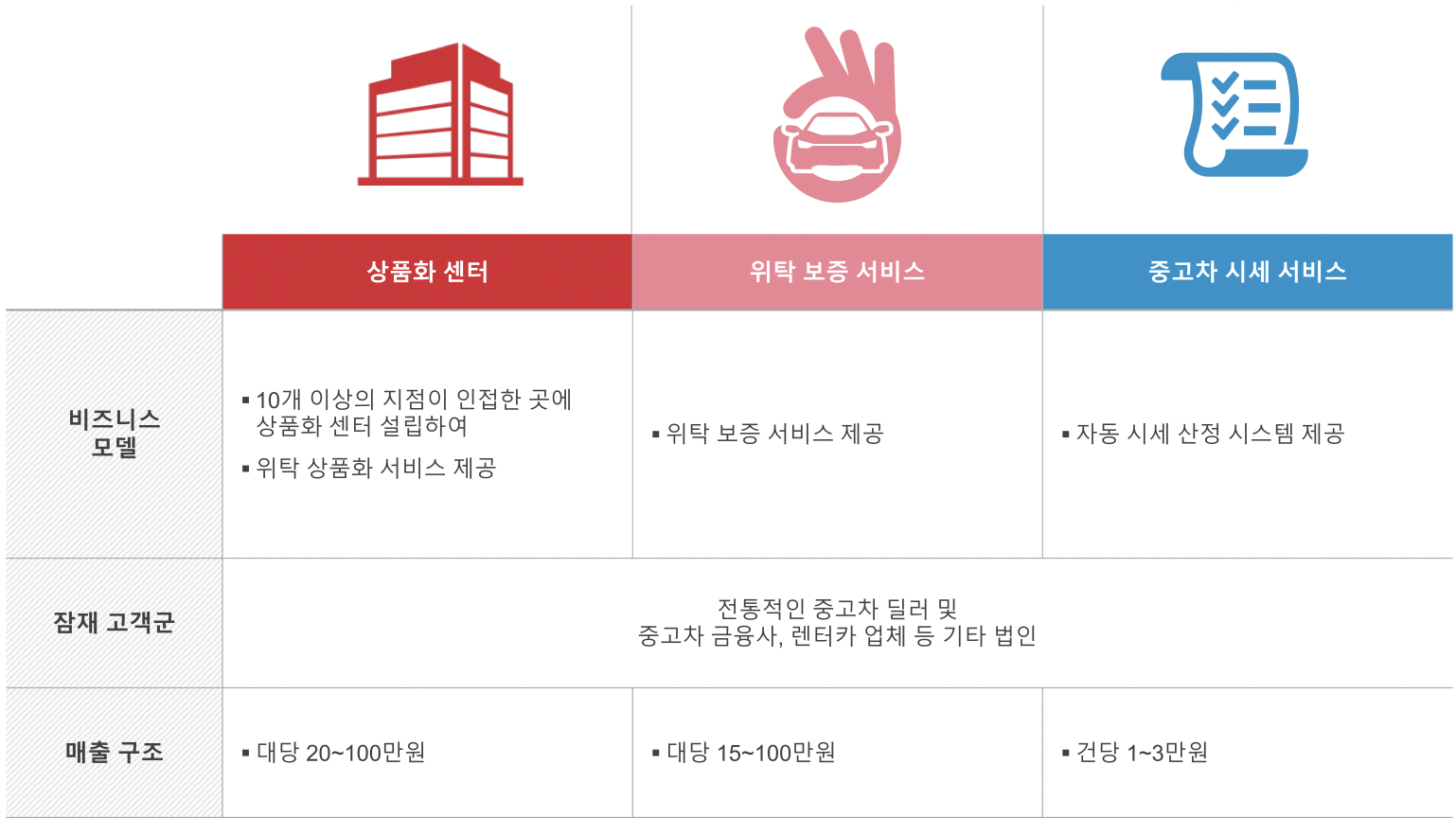 또한 일반 고객을 대상으로 중고차를 매입하고 판매하는 소매 사업(B2C)을 중심으로 매매업자에게 차량을 공급하는 "중고차 경매 사업(B2B)"과 법인 및 개인을 대상으로 하는 "렌터카 사업"으로 업무 영역을 다각화해 추가적인 사업 시너지를 만들어 내기 위한 지속적인 노력을 진행 중에 있다.