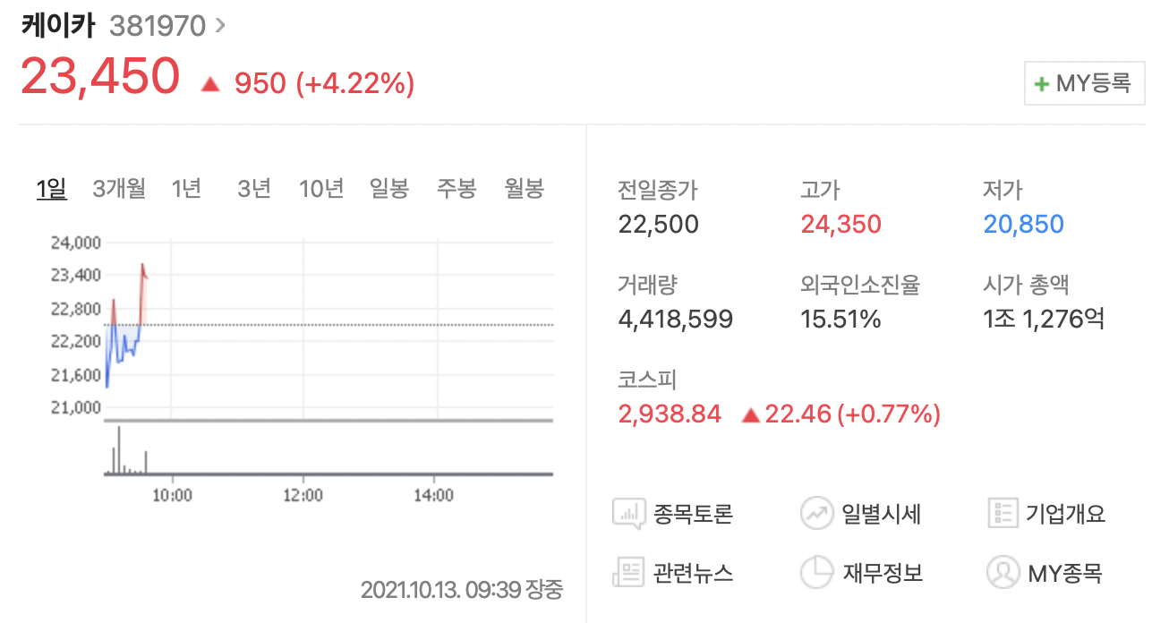 케이카의 공모가는 2만 5천 원으로 공모가 대비 소폭 밑돌고 있네요.