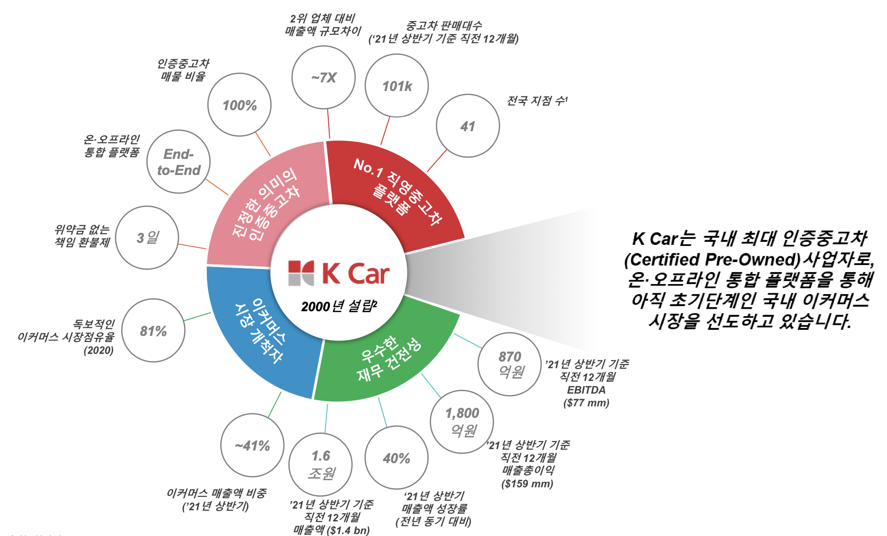 케이카(K Car) 브랜드를 내세워 CPO (Certified Pre-Owned) 모델을 기반으로 이커머스 플랫폼과 전국적인 매입 및 판매 오프라인 네트워크를 직영 구조로 운영하고 있는 국내 중고차 시장 내 매출 규모 1위의 매매업체이다.