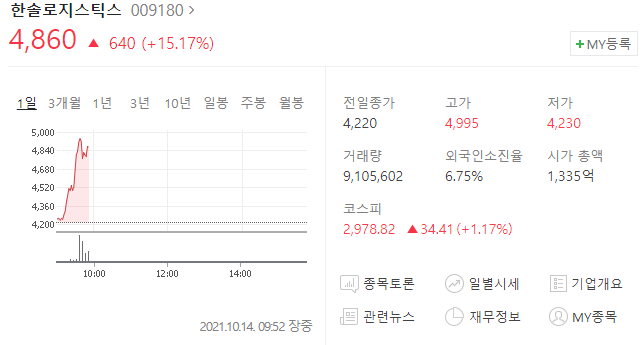 한솔로지스틱스는 삼성SDI의 물류를 전담하고 있어 수혜 기대감이 몰린 것으로 추측하고 있다.