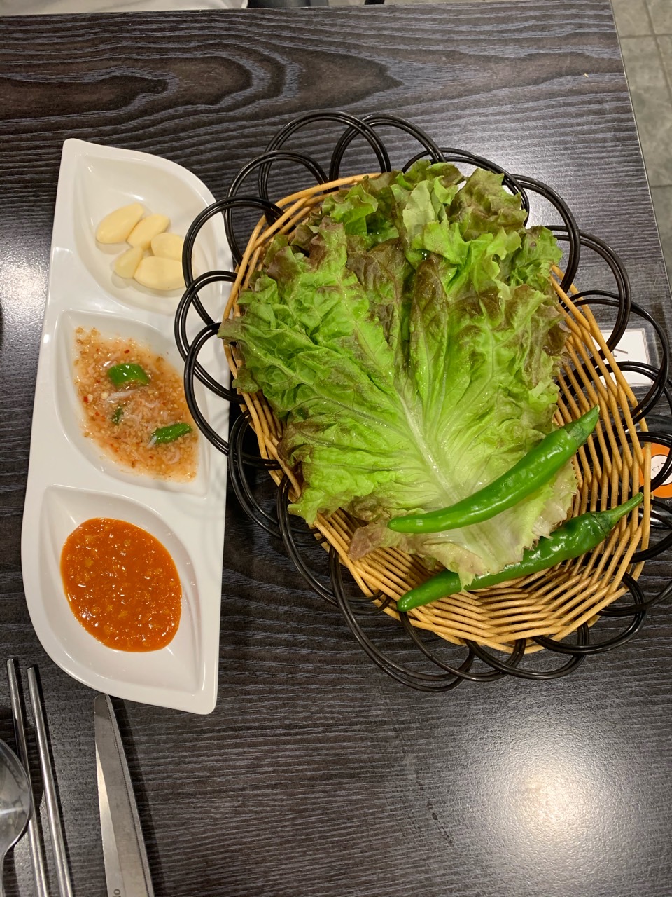반찬은 4가지로 깔끔하게 나왔어요. 거기에 수육이 나오니 상추랑 쌈장 등이 같이 나왔어요.