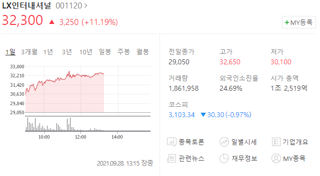 LX인터내셔널 주가가 긍정적인 전망에 급등하고 있다.