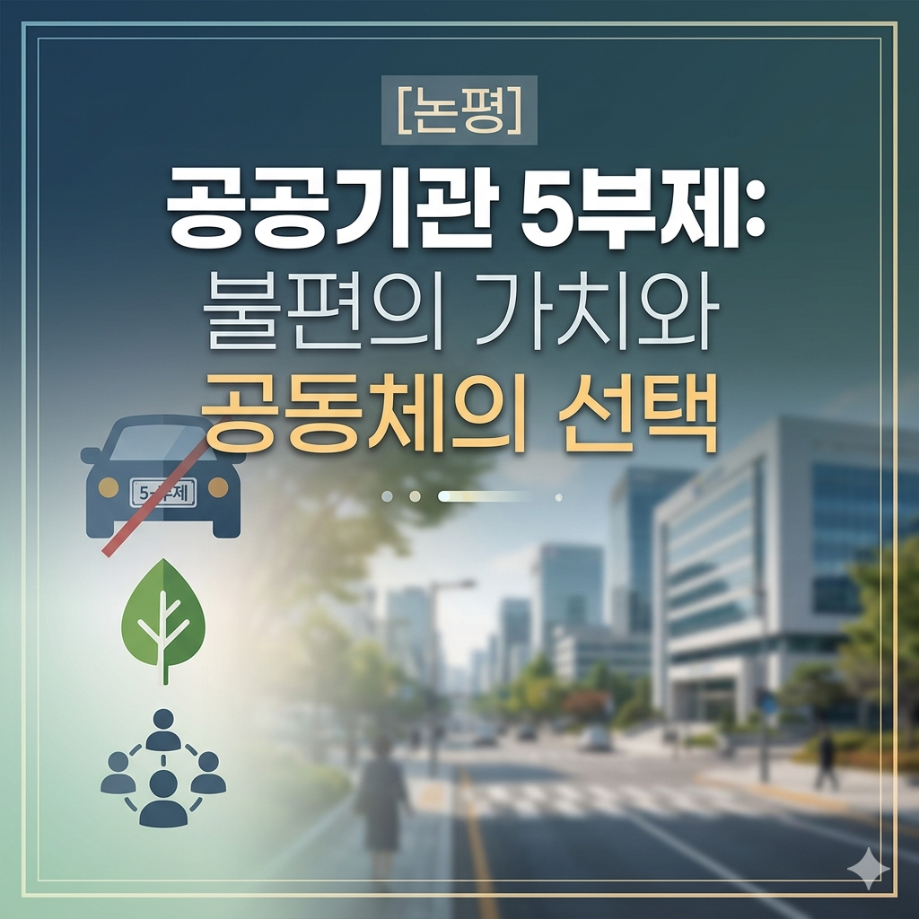 공공기관 5부제는 **'설계된 불편함'**을 통해 개인의 무한한 자유가 공공의 이익과 어떻게 타협해야 하는지를 보여주는 상징적인 사례입니다. "나 하나쯤이야"라는 생각보다 "나부터라도"라는 인식이 모여 시스템 전체의 과부하를 막는 '불편의 경제학'이 작동하는 지점입니다.