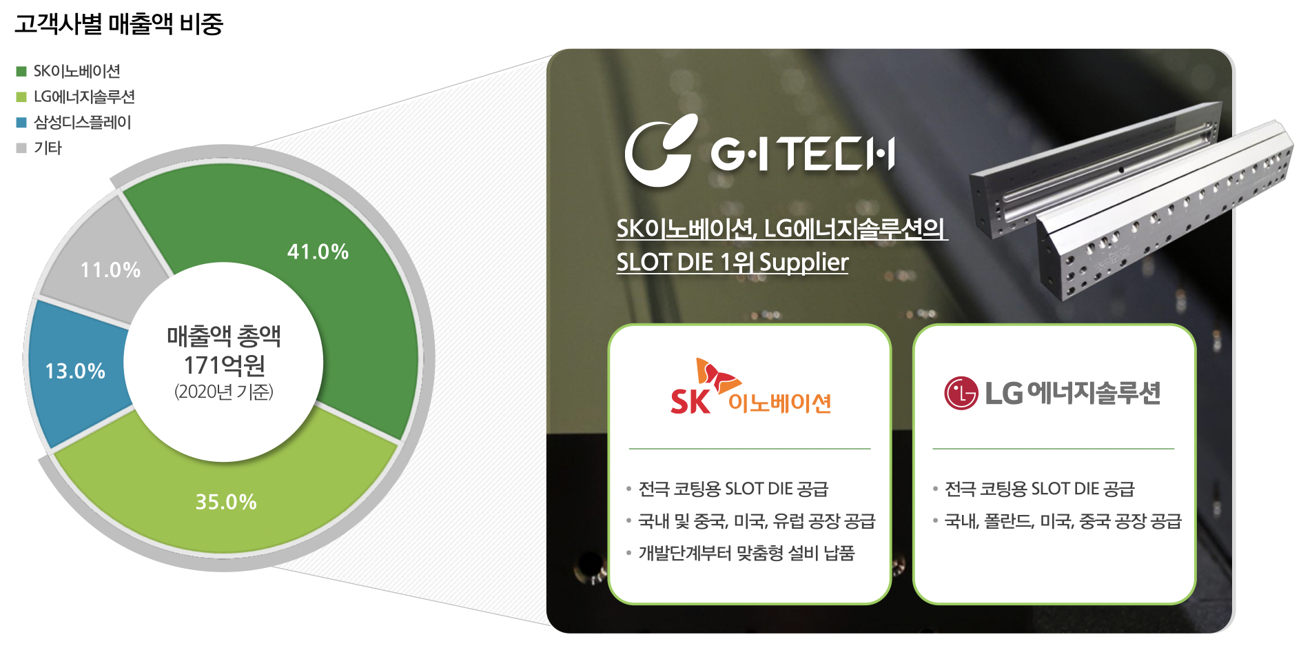 지아이텍은 2차 전지용 코팅 슬롯 다이(SLOT DIE)를 주력으로 생산하는 특수목적용 기계제조업체로 LG에너지솔루션, SK이노베이션, 스웨덴의 노스볼트 등을 고객사로 확보하고 있다.