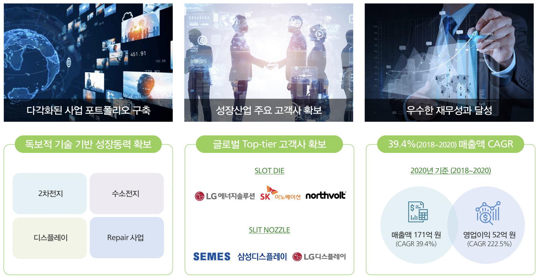 차별화된 기술력을 기반으로 글로벌 Top-tier 2차전지 및 디스플레이 업체와 계약