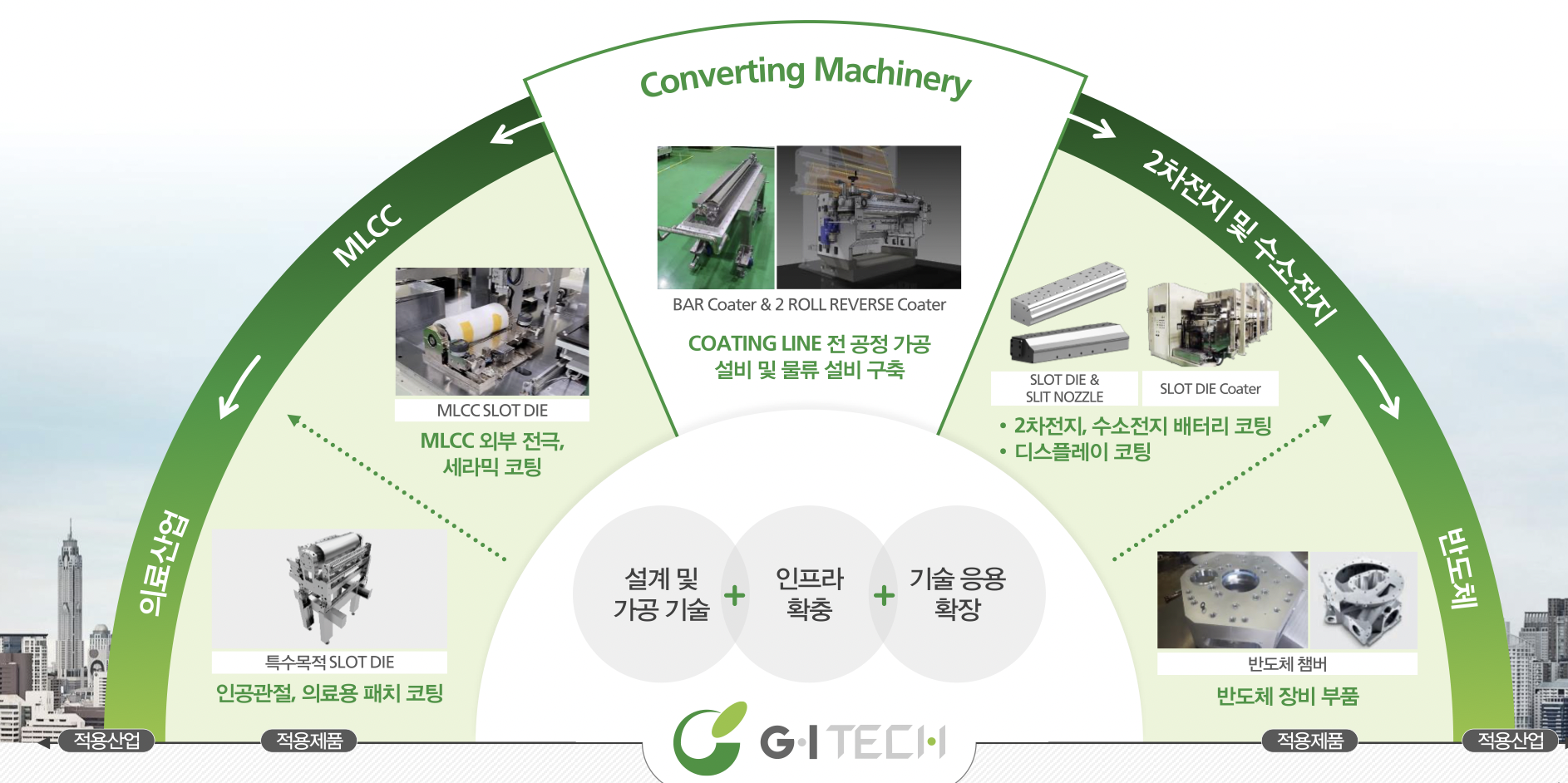 지아이텍은 2차 전지 제조공정에 적용되는 SLOT DIE와 디스플레이 제조공정에 적용되는 SLIT NOZZLE의 제조 및 가공과 해당 제품에 대한 REPAIR 서비스를 주 영업으로 하고 있다.