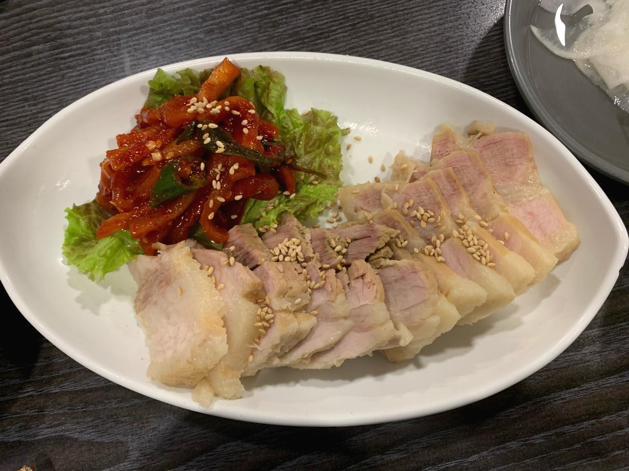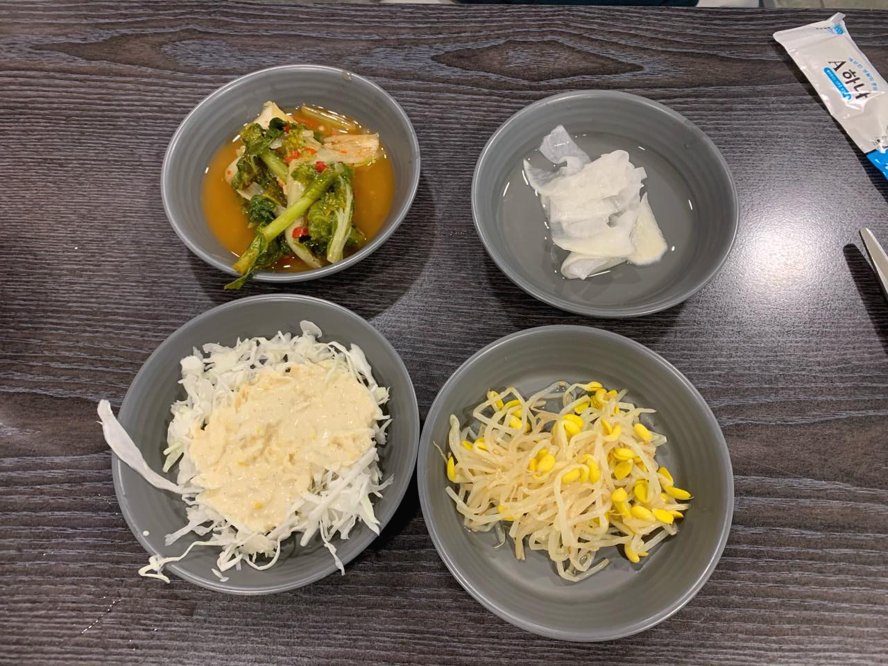 반찬은 4가지로 깔끔하게 나왔어요. 거기에 수육이 나오니 상추랑 쌈장 등이 같이 나왔어요.