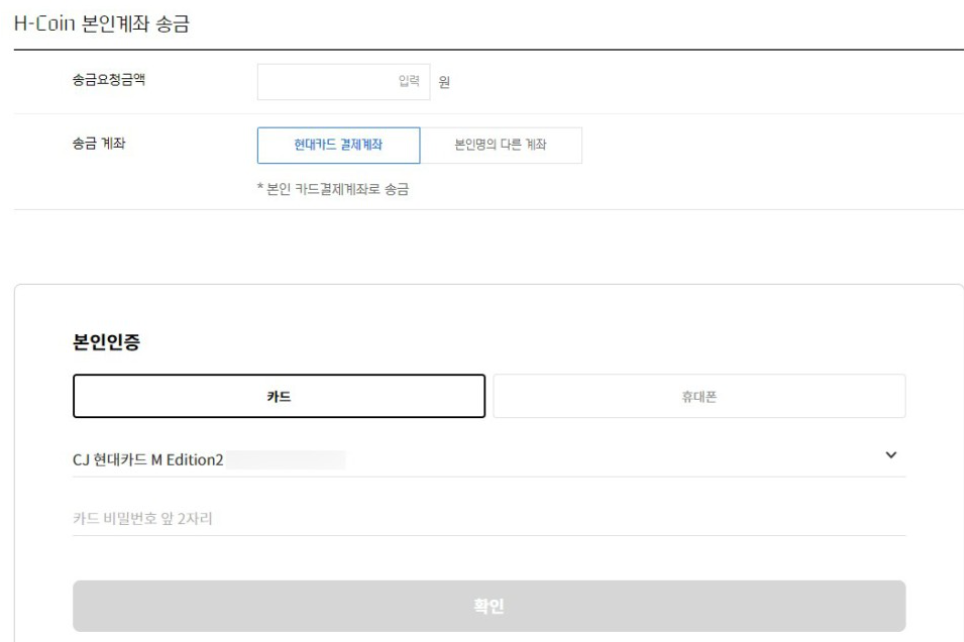 M포인트를 H-Coin으로 전환한 후 본인 계좌로 송금하는 방식입니다.