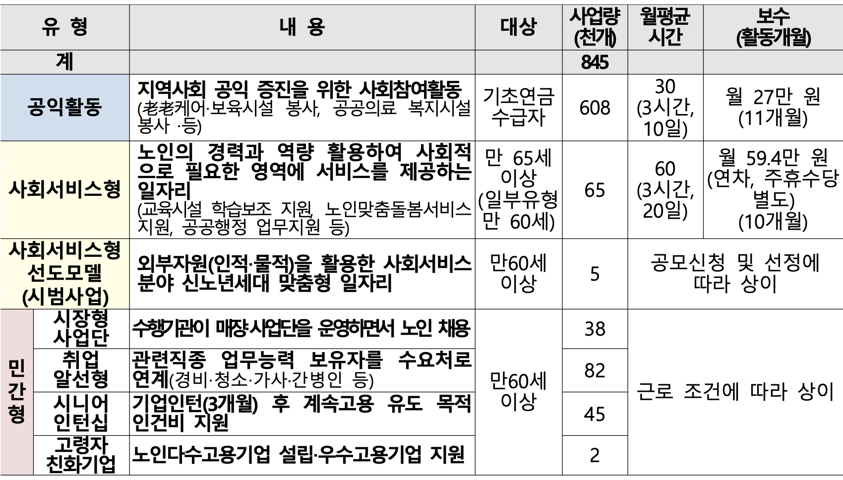 오늘부터 모집하는 사업은 공익활동, 사회서비스형, 시장형 사업단으로 만 60세 또는 만 65세 이상이라면 조건에 따라 신청이 가능합니다.