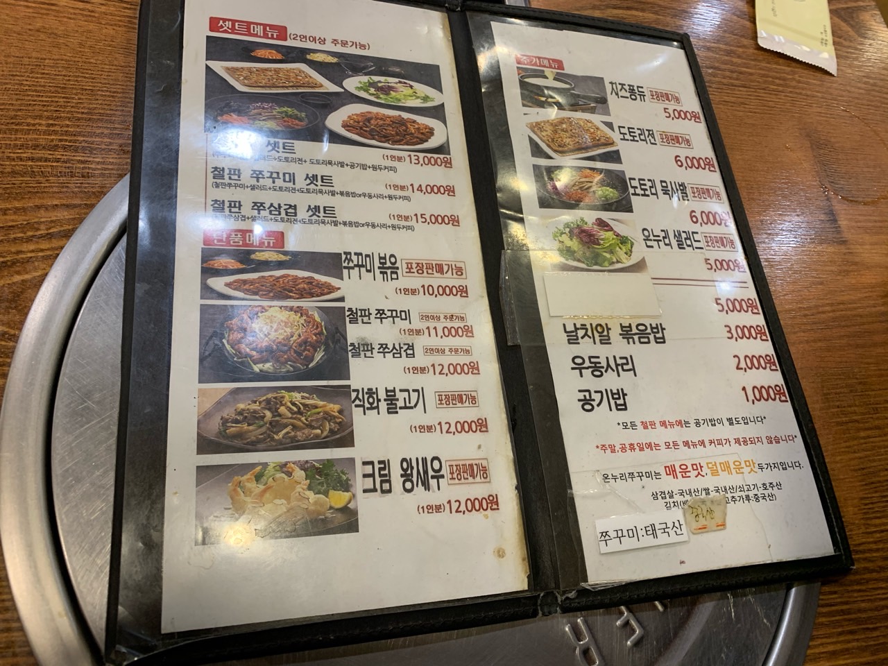 셋트메뉴와 단품메뉴가 있는데 저희는 철판 쭈꾸미 셋트로 시켰습니다.